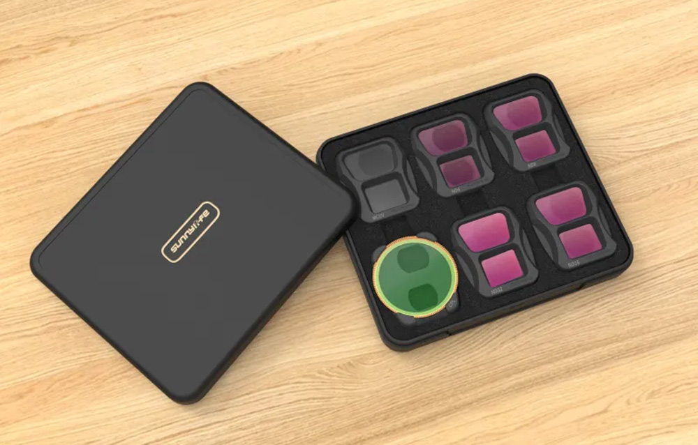 Filtry pasujące do DJI AIR 3, wykonane z aluminium i szkła optycznego, ważą 4 gramy na sztukę. Kompaktowe, łatwe w transporcie. Zestaw zawiera etui z pianki EVA, chroniące filtry.