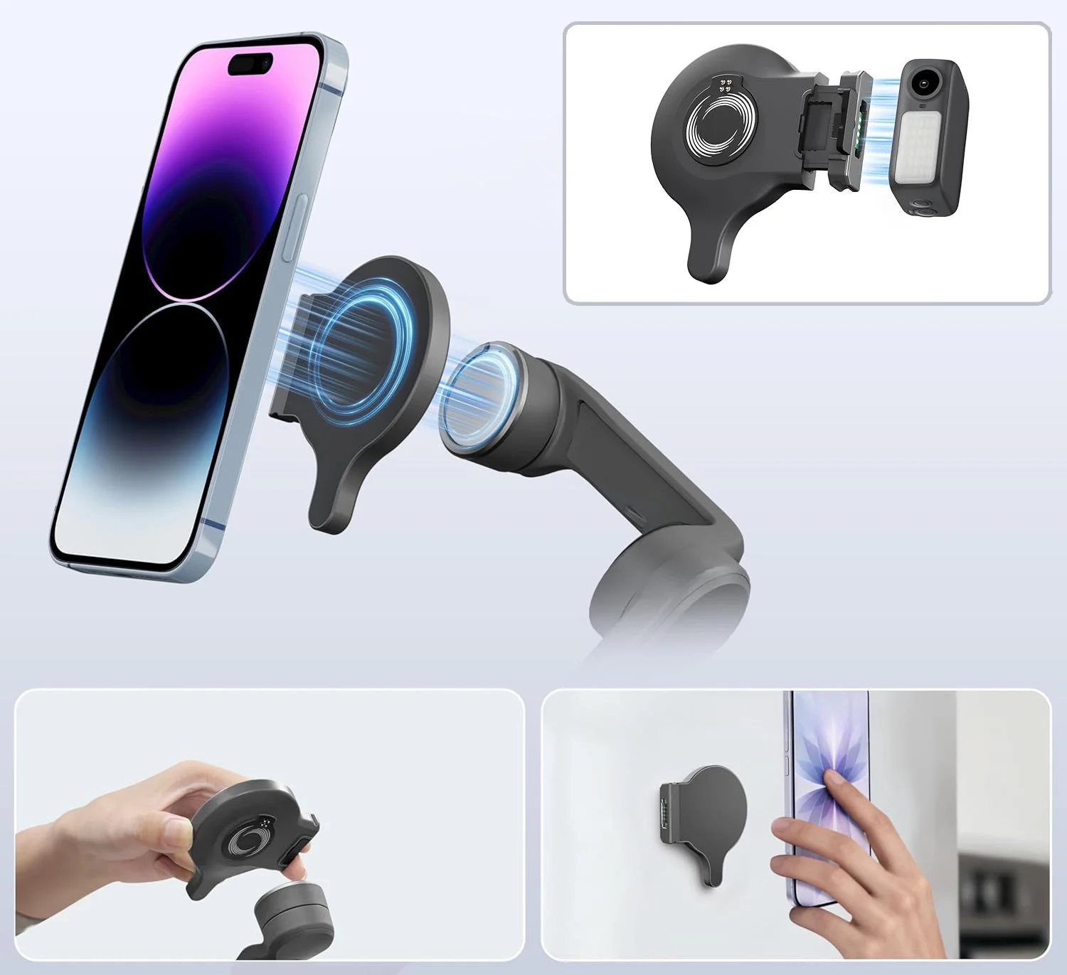 Po odpięciu od gimbala uchwyt może działać jako samodzielny magnetyczny holder – na przykład na lodówce, sprzęcie na siłowni czy metalowych elementach w domu. Jeśli chcesz użyć go na gładkiej, niemagnetycznej powierzchni, możesz posiłkować się dołączoną płytką magnetyczną. To praktyczna funkcja bonusowa, szczególnie do rozmów wideo, oglądania treści lub wygodnego ustawienia telefonu bez trzymania go w ręce.