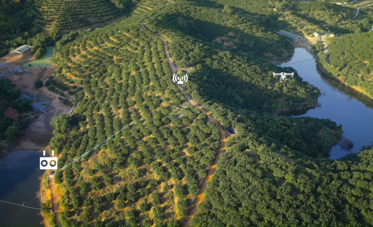 DJI AGRAS T50 obsługuje omijanie przeszkód i śledzenie terenu podczas pomiarów sadów na zboczach o nachyleniu do 20°. Dzięki aparaturze RC Plus i jej możliwościom mapowania w czasie rzeczywistym, T50 może automatycznie identyfikować drzewa owocowe i przeszkody. Na podstawie rozmieszczenia drzew owocowych, dron generuje dokładne i w pełni automatyczne trasy lotu 3D.5 ha zmapowane w 10 minut