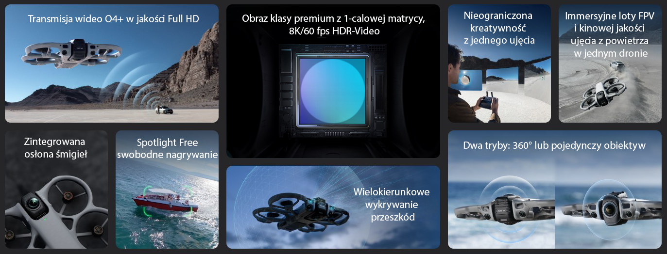 | Funkcje | ActiveTrack 360°, Spotlight Free, Easy ACRO, Vision Assist, śledzenie ruchów głowy, zdjęcia 360° 120 MP / 16K, HDR, D-Log M |