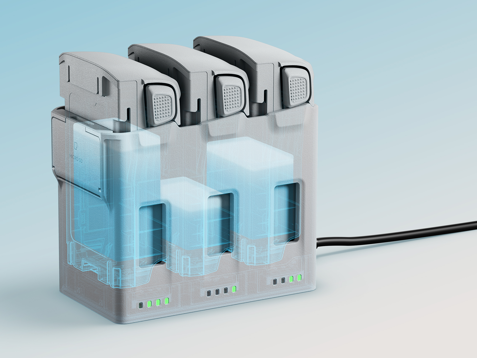 - Ładowanie akumulatorów: przy użyciu DJI 65W Portable Charger oraz hubu ładowania pełne naładowanie jednego akumulatora zajmuje około 45 minut, a trzech akumulatorów około 87 minut.