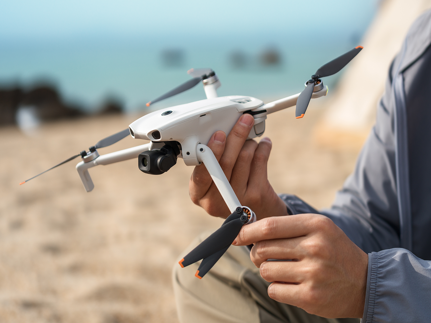 Za płynność ujęć odpowiada 3-osiowy gimbal mechaniczny, który stabilizuje kamerę w osiach tilt, roll i pan. To właśnie ten element odpowiada za ograniczenie drgań i poprawę płynności obrazu podczas lotu, dzięki czemu nagrania wyglądają bardziej profesjonalnie i są przyjemniejsze w odbiorze. Obiektyw o polu widzenia 79°, ekwiwalencie ogniskowej 26,2 mm i jasności f/1.8 dobrze sprawdza się w wielu zastosowaniach – od szerokich pejzaży po codzienne ujęcia z podróży. Całość tworzy zestaw, który pozwala nagrywać stabilnie, wygodnie i z dużą swobodą twórczą.