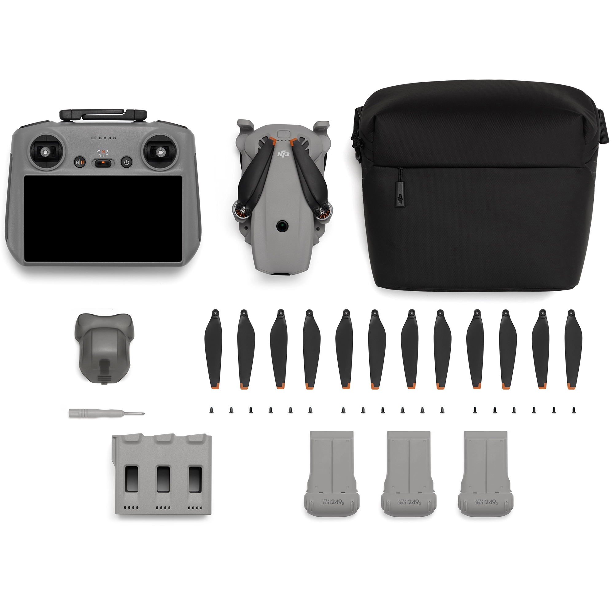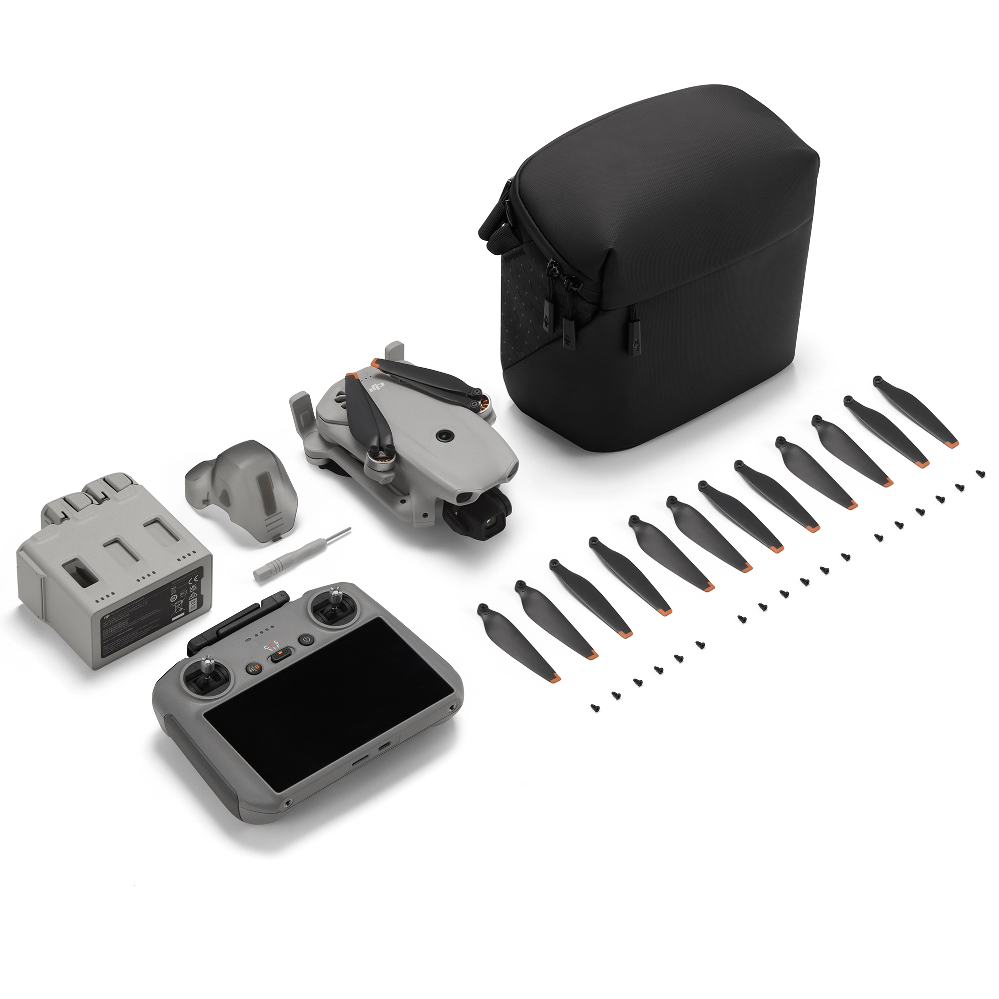 Zestaw Fly More Combo z kontrolerem DJI RC 2, 3 akumulatorami, hubem do ładowania i torbą na ramię.