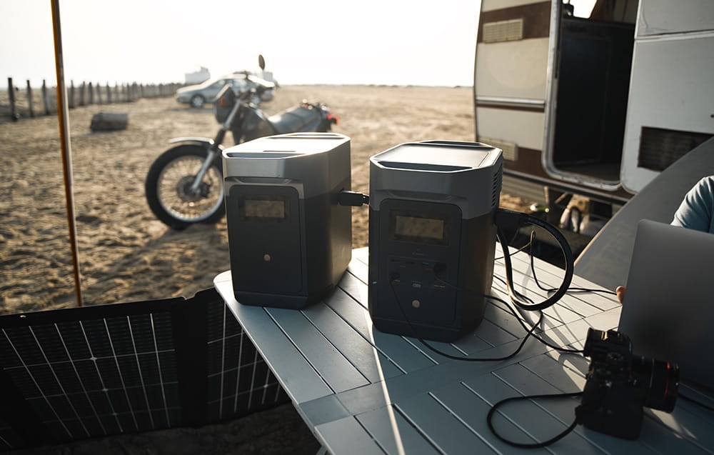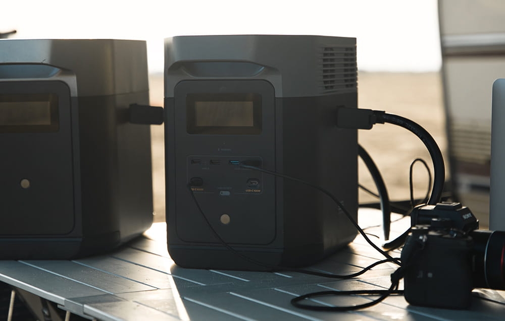 DELTA 2 i dodatkowy akumulator ładują się i rozładowują w sposób jednolity. Ładowanie z przenośnych paneli słonecznych, gniazdek AC lub naszego inteligentnego generatora pradu jest bardzo łatwe.