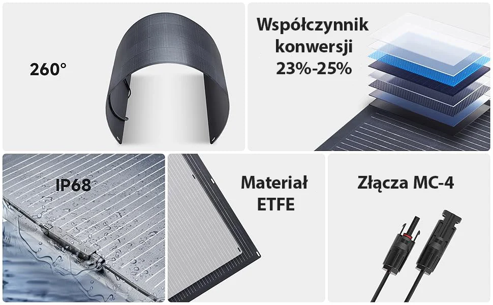 Materiał ogniw: Monokrystaliczny krzem + ETFE