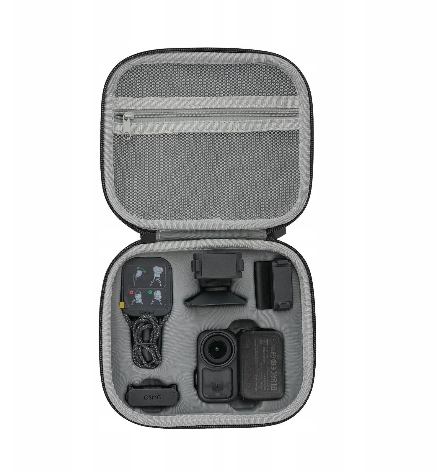 Pomimo swojej pojemności futerał pozostaje lekki i poręczny. Waga netto to tylko 167 g, a kompaktowe wymiary 178 × 156 × 64 mm sprawiają, że bez problemu zmieści się w plecaku, torbie czy większym organizerze podróżnym. To bardzo wygodne rozwiązanie dla osób, które chcą mieć kompletny zestaw Osmo Nano zawsze pod ręką, bez dokładania do bagażu zbyt dużego i ciężkiego etui.