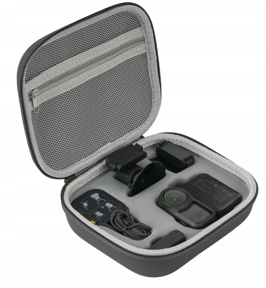 W futerale zmieścisz kamerę z obudową ochronną, magnetyczną smycz, magnetyczny klips do czapki, dwukierunkowy adapter magnetyczny z głowicą kulową oraz składany adapter quick-release. Dzięki temu otwierasz etui i od razu masz pod ręką kompletny zestaw gotowy do nagrywania bez konieczności szukania poszczególnych akcesoriów w różnych kieszeniach czy woreczkach.