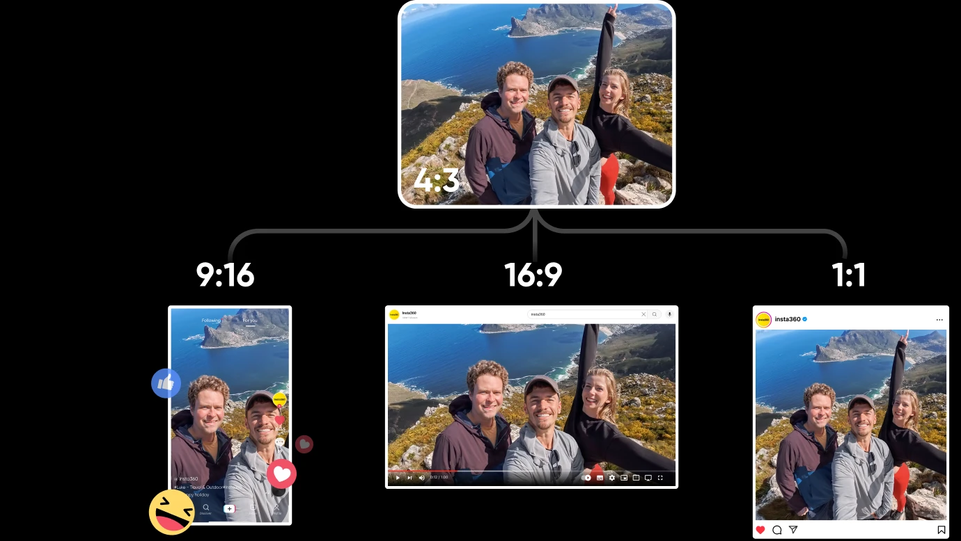 Jedno ujęcie, nieskończone możliwości! Nagrywaj z wolnością eksportu w dowolnym formacie proporcji: 9:16, 16:9, 4:3, 1:1. Udostępniaj swoje treści na mediach społecznościowych w orientacji poziomej lub pionowej, maksymalizując potencjał każdego nagrania!