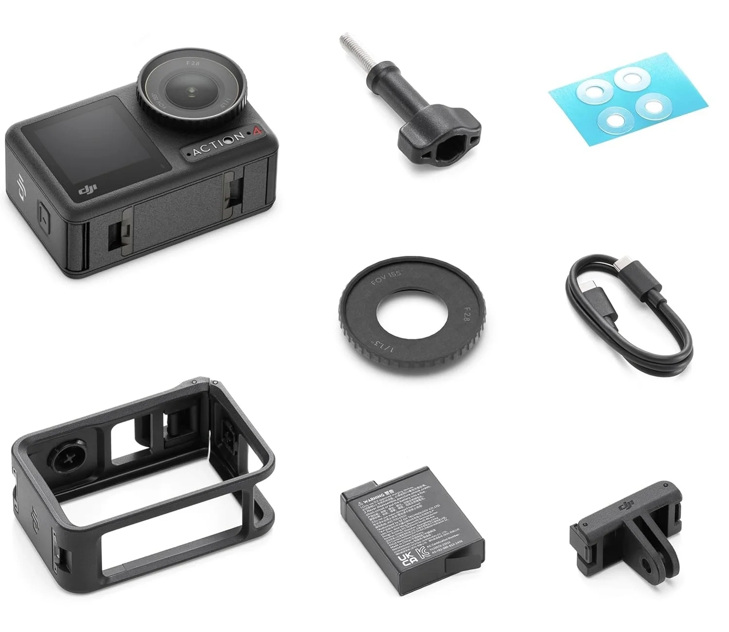 | Wyposażenie | Kamera DJI Osmo Action 4, akumulator, ramka ochronna, mocowanie adaptera z szybkozłączką, osłona obiektywu, kabel USB-C, podkładka antypoślizgowa, śrubka blokująca, naklejka DJI, przewodnik szybkiego startu |