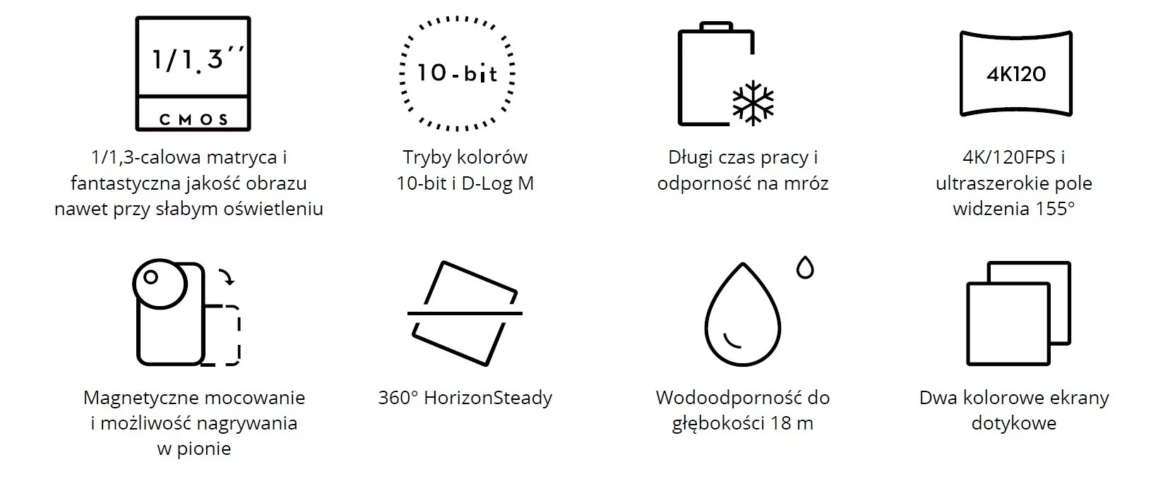 | Funkcje dodatkowe | Tryby stabilizacji RockSteady 3.0, HorizonSteady, HorizonBalancing, tryb Pre-Rec, obsługa nagrywania HDR, 10-bit D-Log M, transmisja na żywo, obsługa komend głosowych |