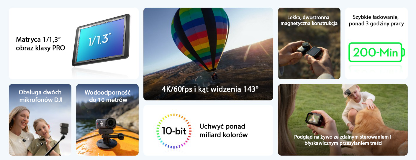 | Funkcje dodatkowe | RockSteady 3.0, HorizonBalancing, Pre-Rec, Hyperlapse, Timelapse, SuperNight, profile 10-bit i D-Log M, Auto Recording, One-Tap Editing, Live Photos, Glamour Effects 2.0 |