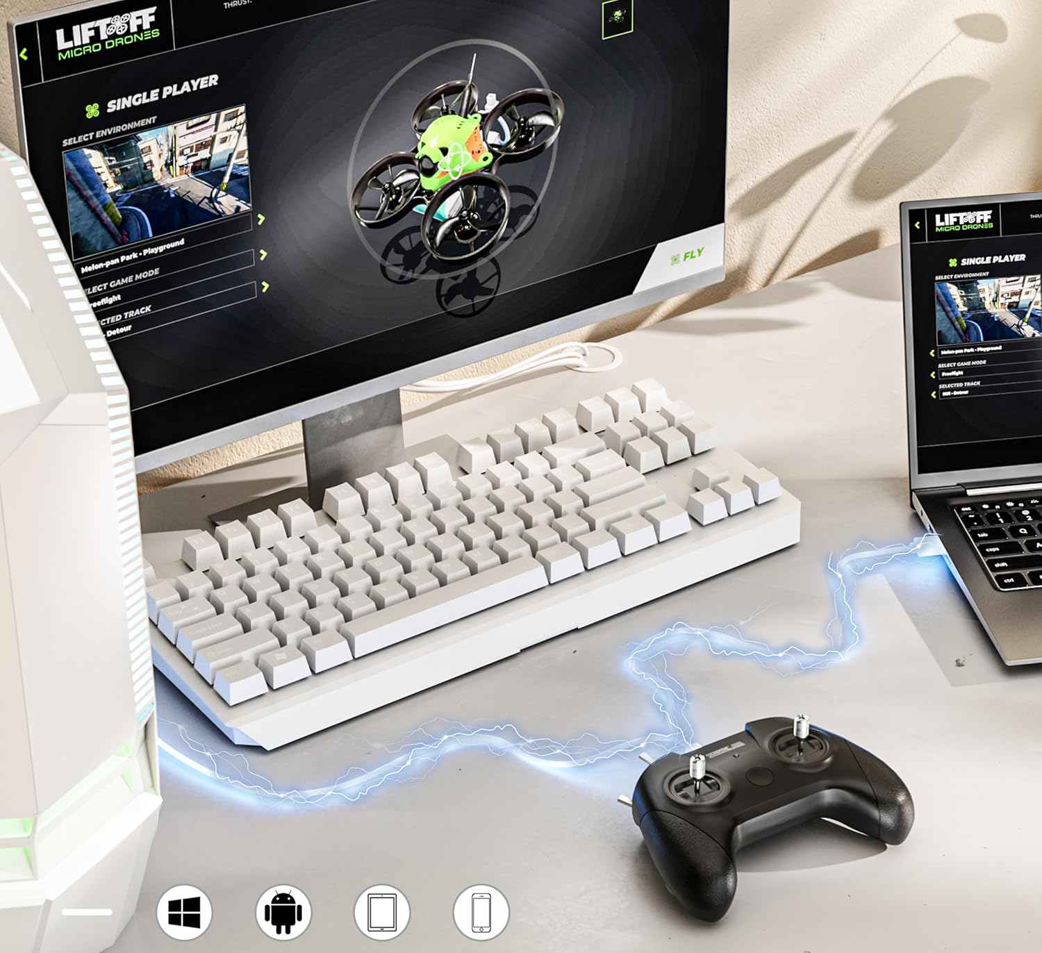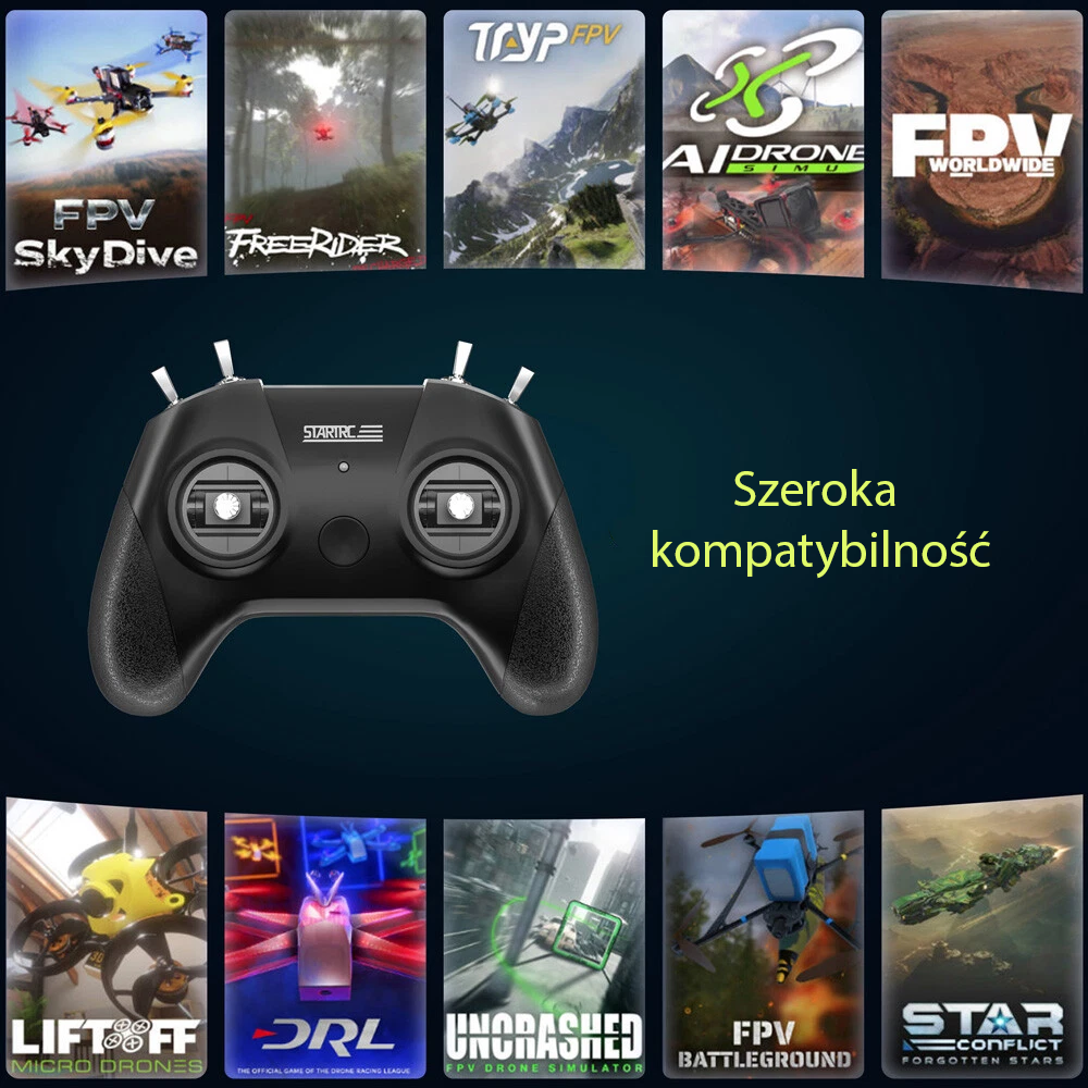 Kontroler bezbłędnie współpracuje z czołowymi tytułami na rynku, takimi jak Velocidrone, Liftoff, Uncrashed, DRL Simulator czy FPV Battleground. To najbezpieczniejsza metoda na podnoszenie swoich kwalifikacji pilotażu, pozwalająca uniknąć kosztownych kraks i uszkodzeń prawdziwego sprzętu podczas nauki nowych manewrów.