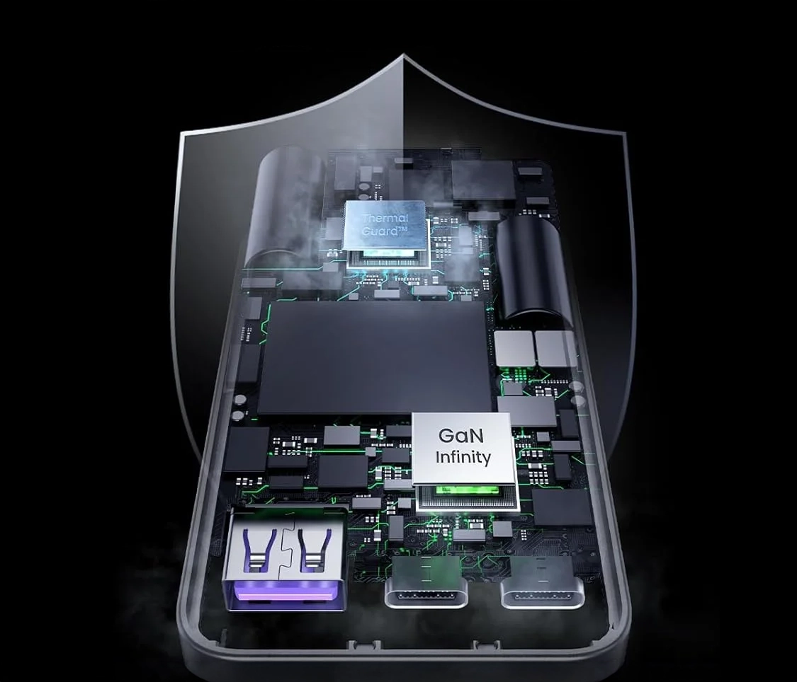 Zastosowanie technologii GaN Infinity pozwoliło uzyskać wysoką wydajność przy zachowaniu kompaktowych wymiarów. Ładowarka jest mniejsza od tradycyjnych modeli o podobnej mocy, dlatego łatwiej zmieścić ją w torbie, plecaku czy organizerze na elektronikę. Technologia GaN poprawia również efektywność energetyczną i ogranicza nagrzewanie urządzenia podczas pracy. To ważna zaleta przy intensywnym użytkowaniu, zwłaszcza gdy z jednego zasilacza korzysta kilka urządzeń równocześnie.