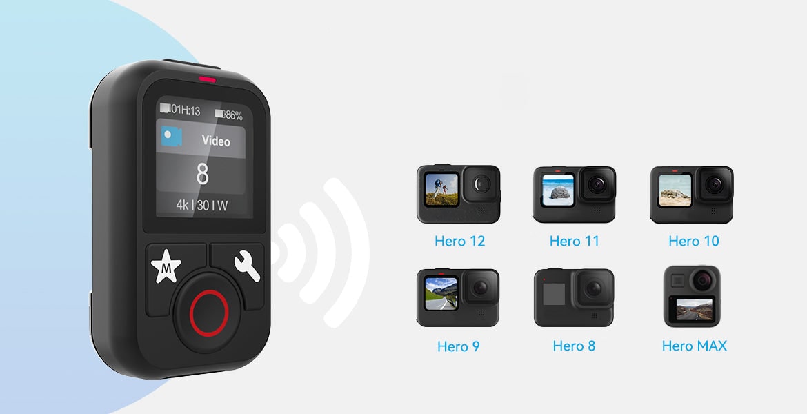 Pilot Bluetooth Telesin T13 jest kompatybilny z modelami GoPro Hero 13/12/11/10/9/8/MAX. Dzięki temu urządzeniu możesz kontrolować kamerę zdalnie, mając dostęp do różnych trybów nagrywania oraz informacji o baterii i czasie nagrywania.