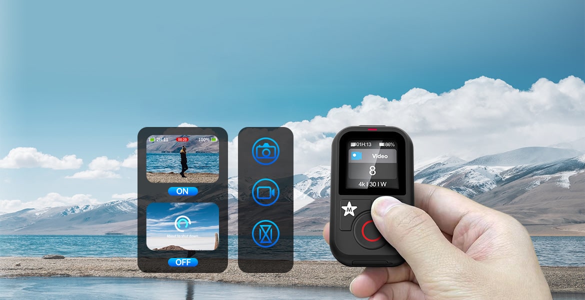 Pilot Telesin T13 oferuje wiele trybów pracy, w tym możliwość przełączania między trybami zdjęć, wideo oraz timelapse. Jednym kliknięciem możesz włączyć lub wyłączyć kamerę i łatwo zmieniać ustawienia.