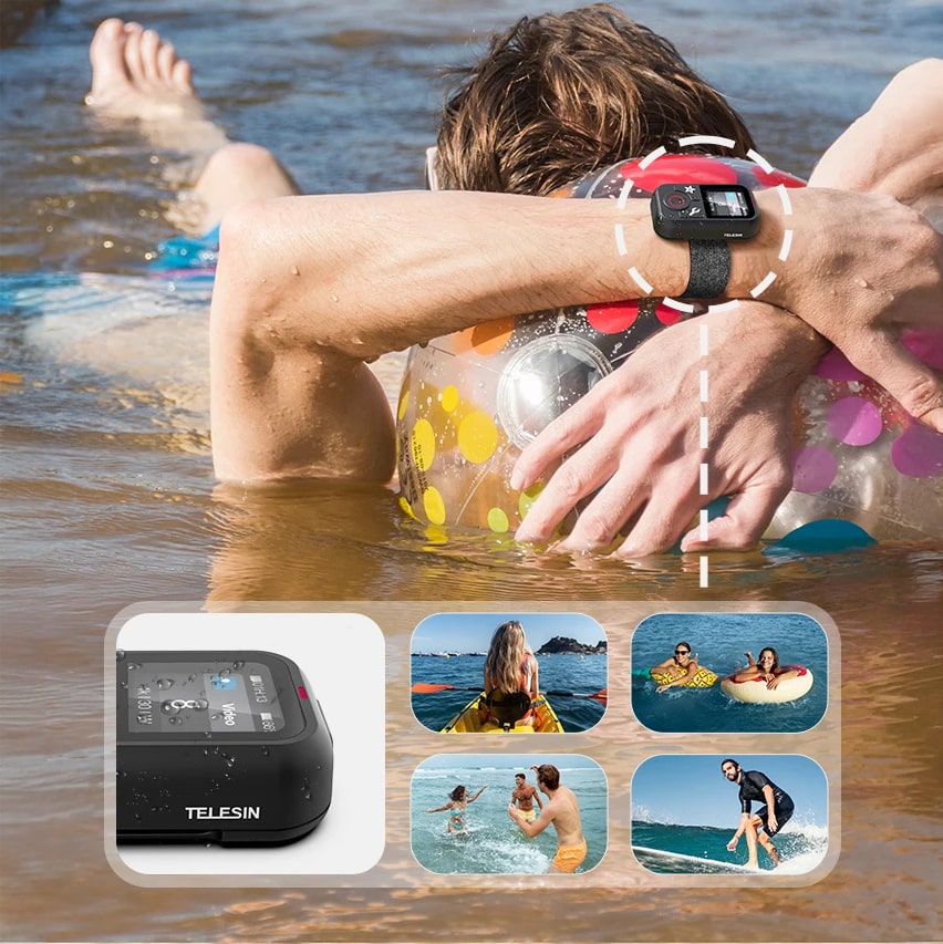 Pilot Telesin jest wodoodporny do głębokości 1 metra, co czyni go idealnym do nagrywania w trudnych warunkach, zarówno na lądzie, jak i pod wodą. Dzięki tej funkcji możesz bez obaw korzystać z pilota podczas aktywności wodnych.