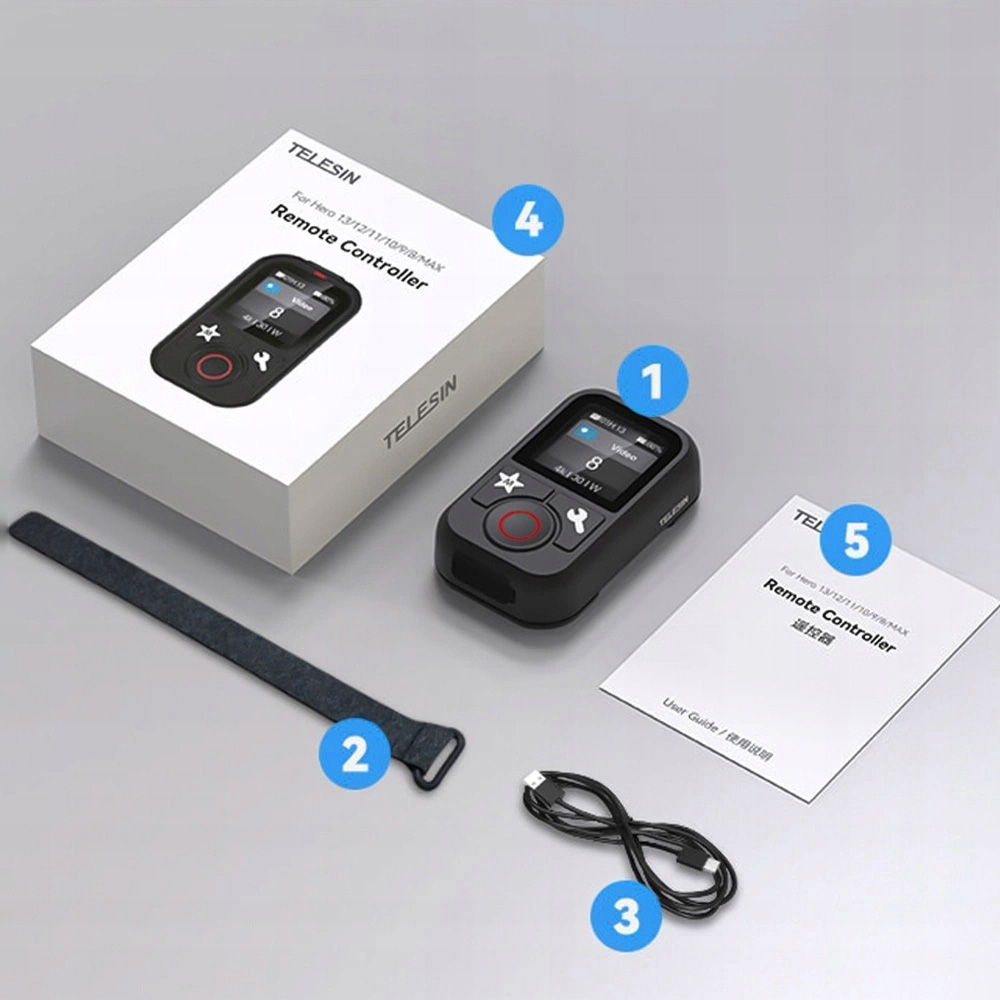 | Zawartość zestawu | Pilot Bluetooth Telesin T12, Pasek na nadgarstek, Smycz, Kabel do ładowania, Pudełko, Instrukcja |