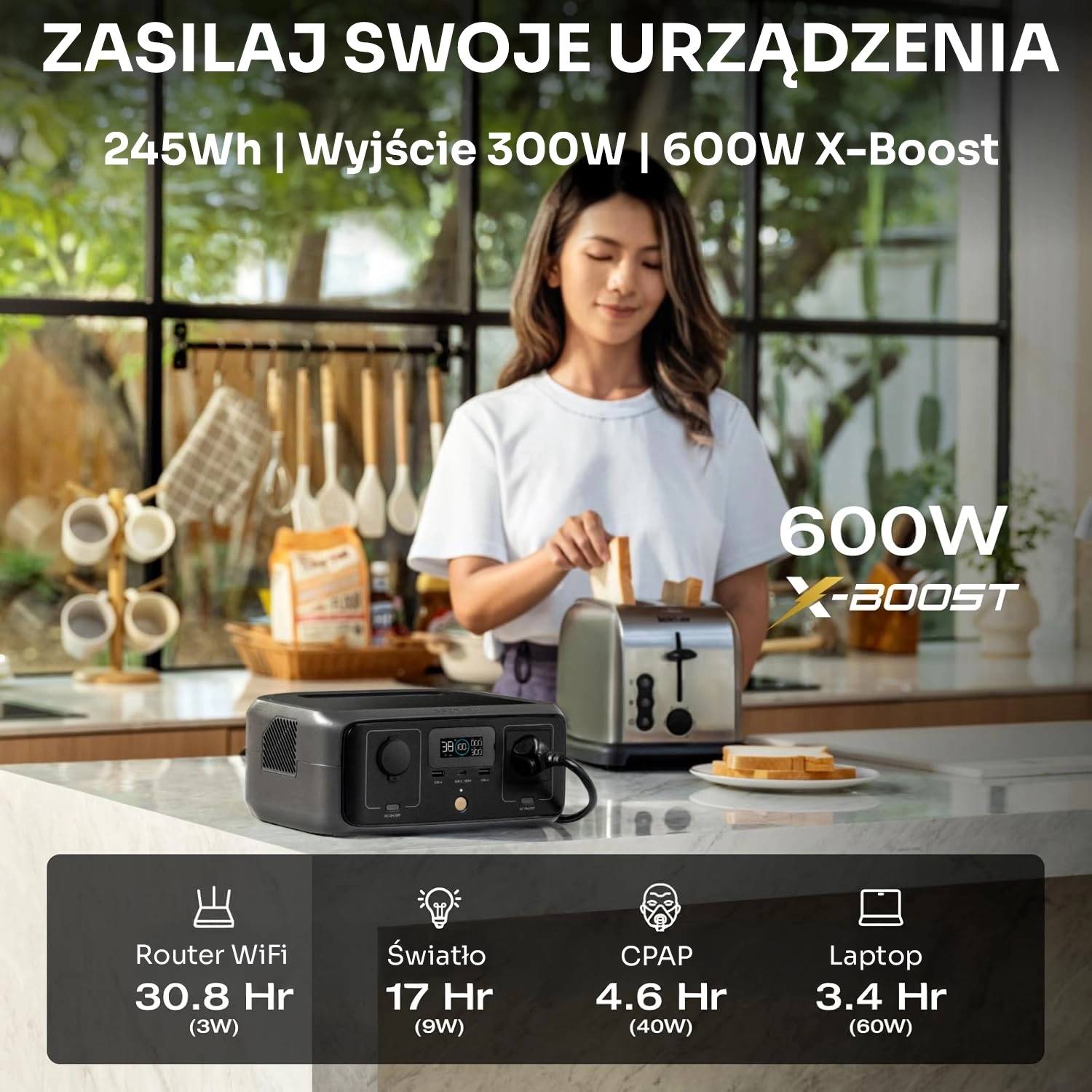 Obsługuj urządzenia domowe o mocy do 600W, takie jak opiekacze czy mini piecyki, bez wysiłku dzięki technologii X-Boost.