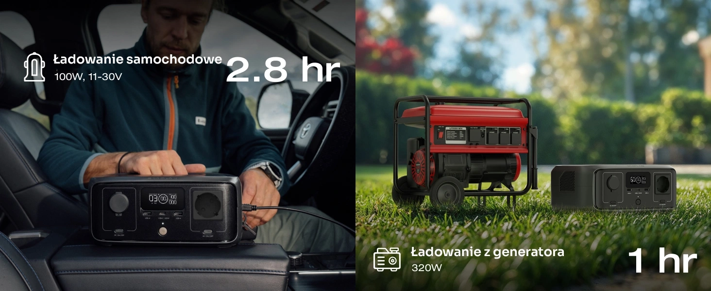 Uzupełnij energię w 2,8 godziny z ładowania samochodowego (100W, 11-30V) lub w 1 godzinę przy użyciu 320W generatora. Idealne rozwiązanie w podróży!