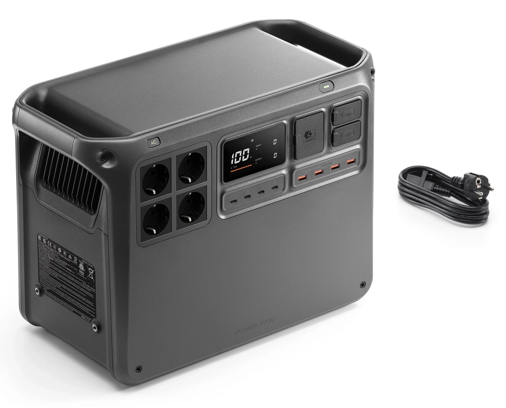 Z przodu obudowy znajdziesz 4 porty AC, 4 porty USB-C, 4 porty USB-A oraz 2 porty SDC, dzięki czemu możesz zasilać i ładować różne typy sprzętu jednocześnie. Od smartfonów, przez aparaty i laptopy, po energochłonne urządzenia domowe – DJI Power 2000 radzi sobie z nimi bez wysiłku. Każde gniazdo oferuje stabilną i bezpieczną pracę, co czyni stację uniwersalnym narzędziem w każdej sytuacji.