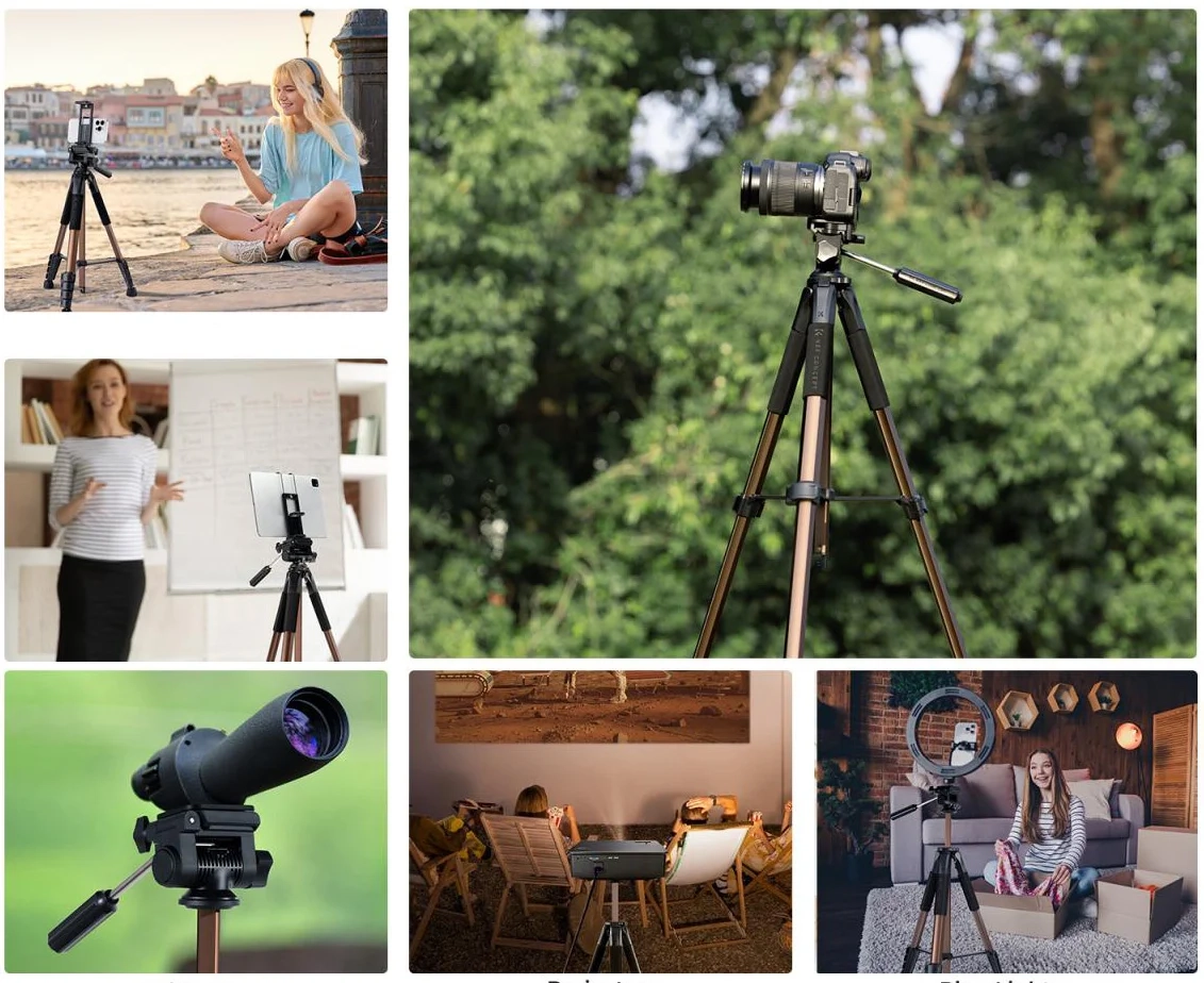 W komplecie znajduje się ulepszony uchwyt 2w1 na telefon i tablet, który współpracuje z telefonami o szerokości 2,1–3,67 cala oraz tabletami o szerokości 4,6–7,8 cala. Dzięki temu statyw nadaje się nie tylko do aparatów, ale również do mobilnego tworzenia treści.