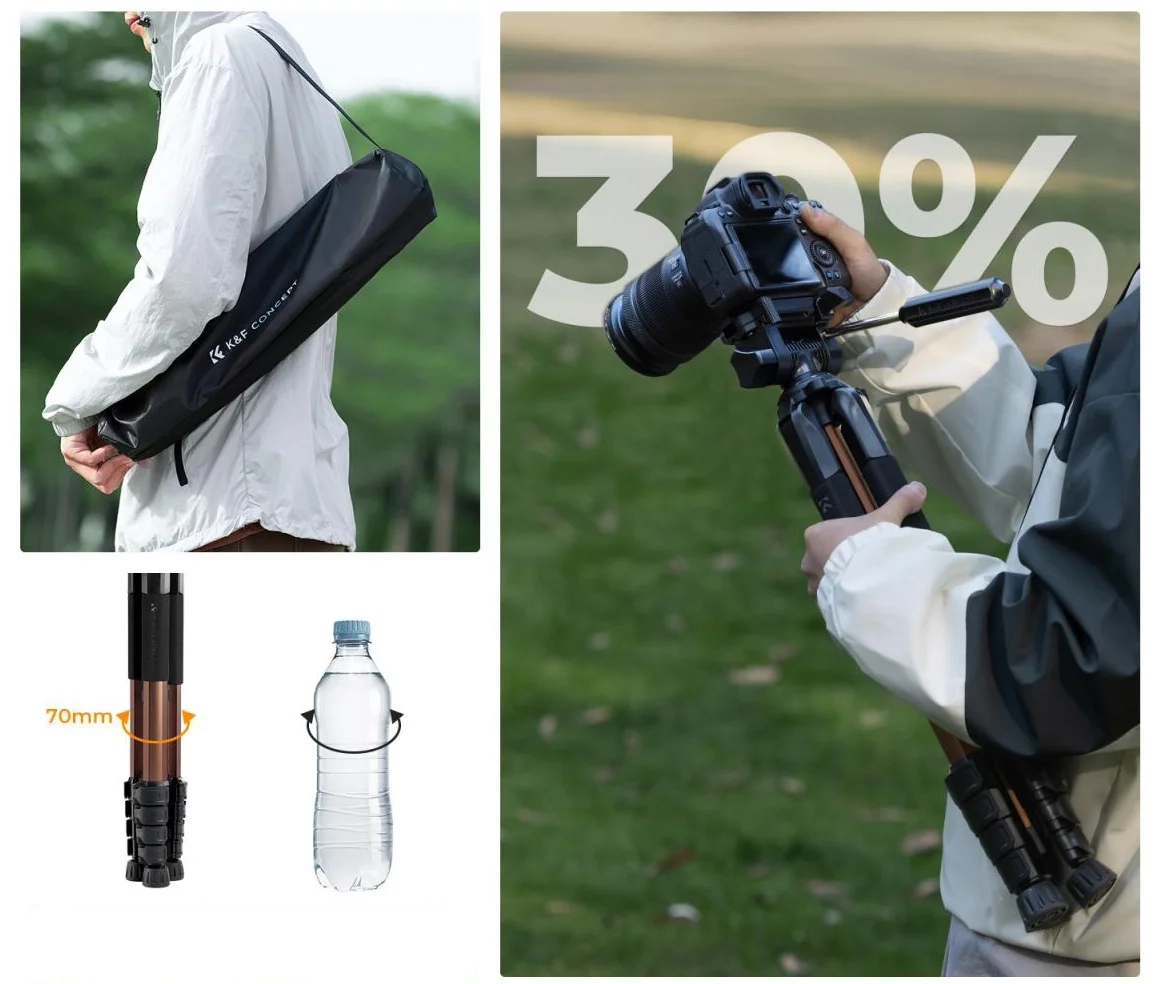 K&F Concept S255A3+BV01 to uniwersalny statyw dla osób, które fotografują i nagrywają zarówno aparatem, jak i smartfonem. Dzięki niskiej wadze 1,2 kg i długości po złożeniu wynoszącej tylko 50 cm, model dobrze sprawdza się w podróży, podczas plenerów i w codziennym użytkowaniu.