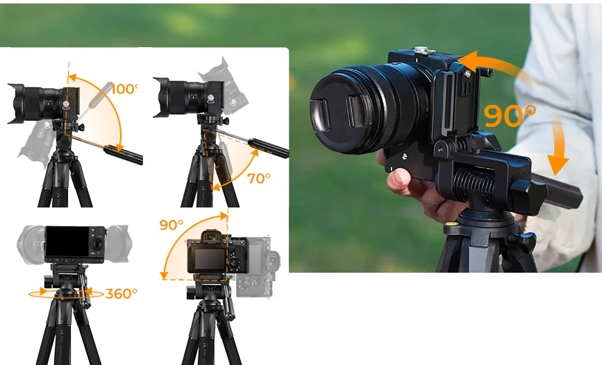 Dzięki temu łatwo przygotować ujęcia poziome, pionowe, niskie i wysokie, bez potrzeby ciągłej zmiany ustawienia całego statywu.
