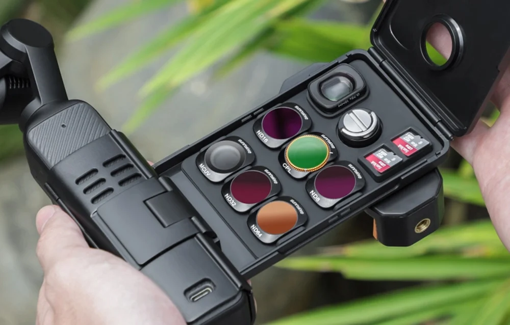 Sunnylife oferuje również praktyczne pudełko do przechowywania filtrów i kart pamięci, co zapewnia lepszą organizację i łatwy dostęp do niezbędnych akcesoriów podczas filmowania. Uchwyt jest starannie zaprojektowany, aby nie ograniczać funkcjonalności kamery, zapewniając niezawodne wsparcie i wygodę użytkowania, zarówno w terenie, jak i w studio.