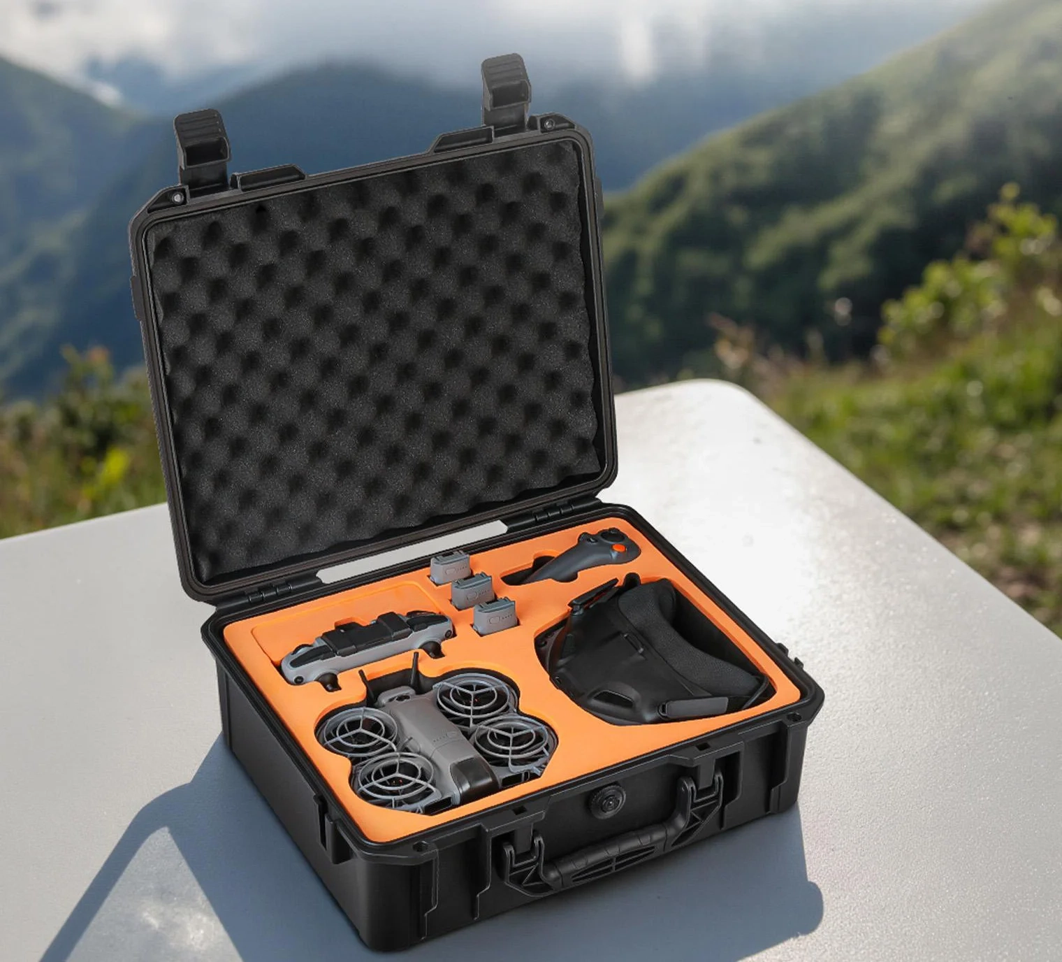 Wnętrze walizki zostało wyposażone w precyzyjnie dopasowaną piankę, która utrzymuje wszystkie elementy w stabilnej pozycji. Etui pomieści drona, kontroler RC-N3, hub ładowania oraz aż 7 akumulatorów, w tym jeden umieszczony w dronie. Dodatkowo przewidziano specjalne miejsca na akcesoria takie jak filtry, śmigła, kable czy powerbank, co pozwala utrzymać porządek i szybki dostęp do sprzętu.