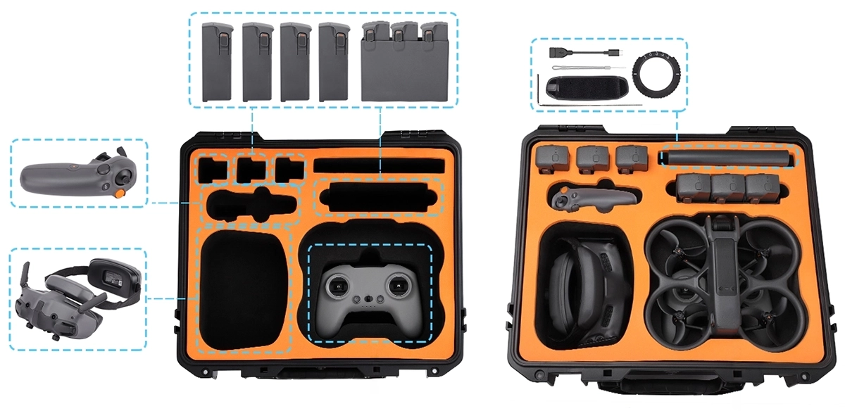 - ✔️ Wyłożenie pianką: Ochrona przed wstrząsami z dedykowanymi wycięciami na akumulatory, drona i kontroler.