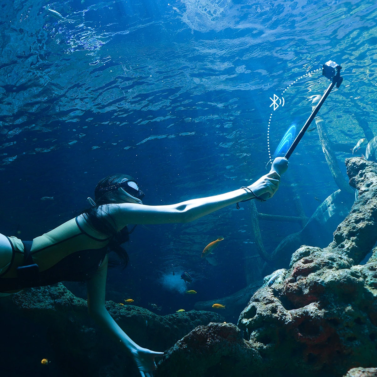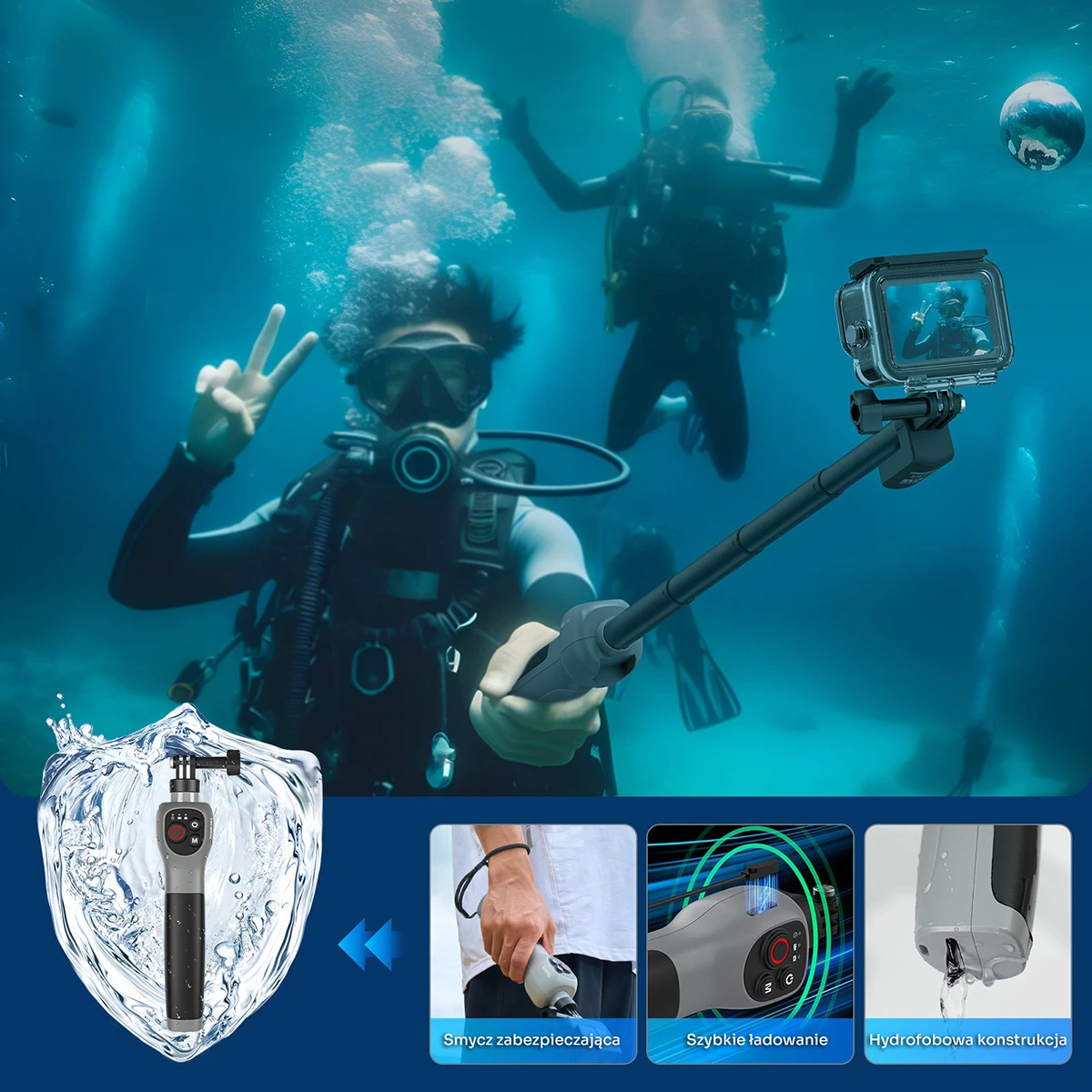 - ⭐️ Zdalne sterowanie pod wodą - Pierwszy selfie stick do GoPro z pełnym sterowaniem pod wodą. Rób zdjęcia i zmieniaj tryby bez wynurzania się.