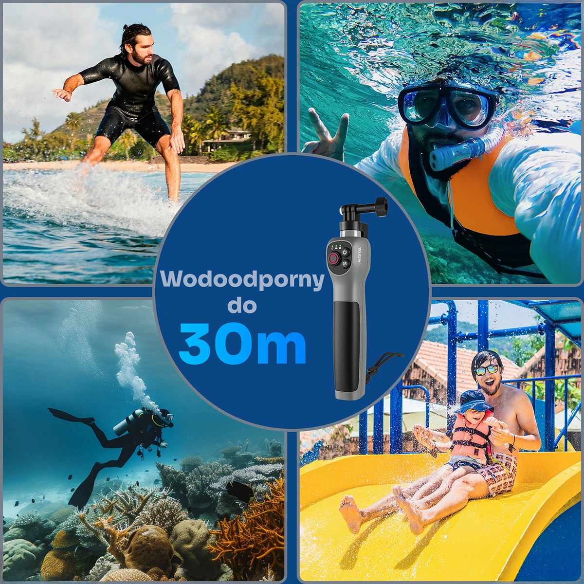 - Entuzjastów sportów wodnych - Świetnie sprawdzi się podczas surfingu, snorkelingu i pływania, umożliwiając robienie spektakularnych ujęć w ruchu, zarówno nad, jak i pod wodą.