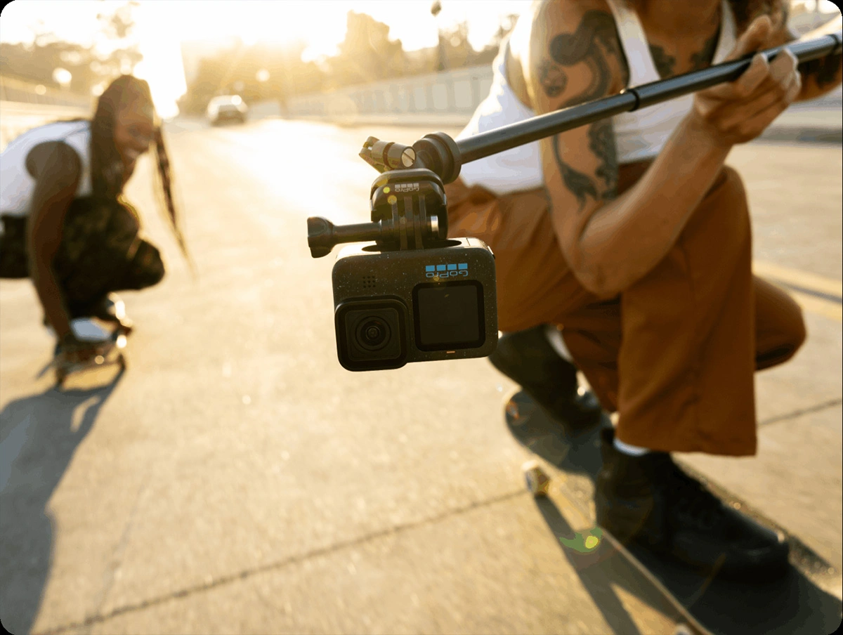Rozciągający się do 122 cm (48 cali) drążek przedłużający z wodoodpornym pilotem zdalnego sterowania pozwala zbliżyć się do akcji i uzyskać lepszy obraz z kamery. Możesz też użyć przegubu kulowego, aby obrócić kamerę na siebie i uchwycić jeszcze więcej scenerii w kadrze.