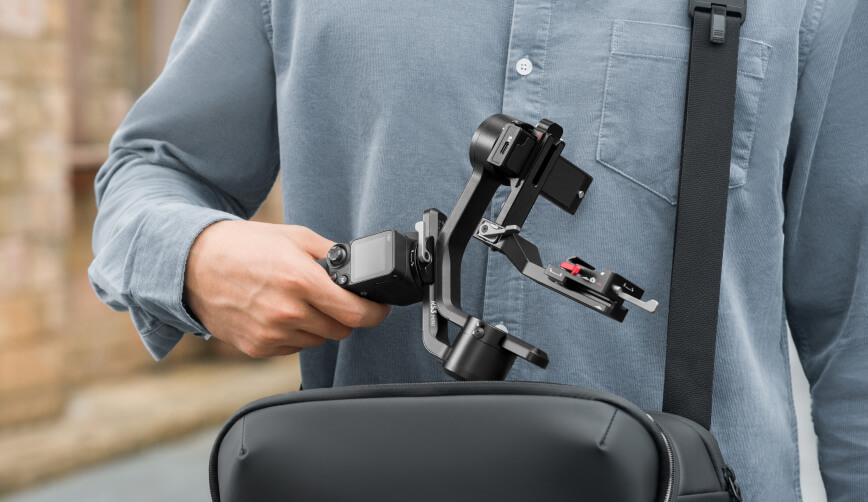 RS 3 Mini cechuje się innowacyjnym designem, który obejmuje mniejszą konstrukcję, zintegrowany akumulator i natywną możliwość nagrywania w pionie. Jest wyjątkowo kompaktowy i przenośny – z łatwością zmieścisz go w torbie, dzięki czemu świetnie sprawdzi się w podróży. Sprzęt waży zaledwie 795 g (w trybie Portrait), co oznacza, że jest o około 50% lżejszy niż RS 3 Pro i o około 40% lżejszy niż RS 3. [1] Ponadto podczas pracy w trybie Horizontal RS 3 Mini waży tylko 850 g. To jednak nie wszystko – odpowiednio położony środek ciężkości zapewnia większą stabilność i ergonomię, kiedy nagrywasz z ręki.