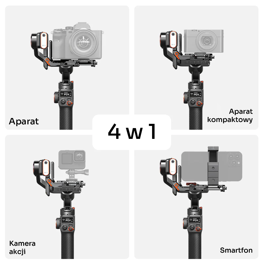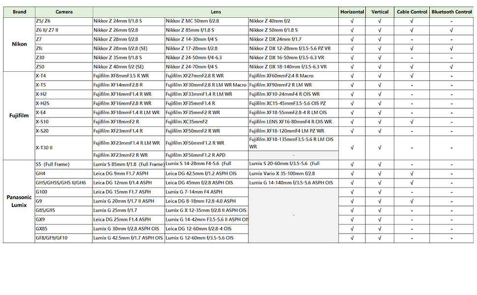 Nie jest to pełna lista a jedynie modele zweryfikowane przez producenta. Wiele innych aparatów i kamer nie wymienionych poniżej również może łączyć się z gimbalem.