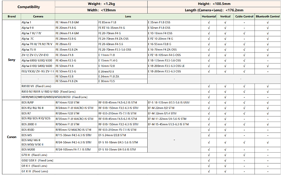 ✳️ Kompatybilność 4 w 1: Teraz obsługujący udźwig do 1,2 kg, ten mały gimbal jest kompatybilny ze smartfonem, kamerą sportową, aparatem kompaktowym i lustrzanką cyfrową. Kompatybilny z aparatami bezlusterkowymi, takimi jak Sony ZV-E10, Sony A7S Ⅲ, Sony FX3, Sony A6000, Canon EOS R5, Canon EOS R8, Nikon Z7Ⅱ, Nikon Z50 itp. * Listę kompatybilności aparatów można sprawdzić w przeglądzie.