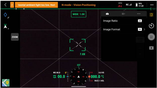 Wybierz "4:3" jako proporcje obrazu, oraz "JPG" jako format obrazu. Zalecamy używanie formatu JPG do przechwytywania danych dla aplikacji fotogrametrycznych. Zapisywanie obrazów RAW znacznie zwiększy rozmiar obrazu, zmniejszy liczbę zdjęć, które można przechwycić, oraz wydłuży czas przetwarzania i przesyłania danych.