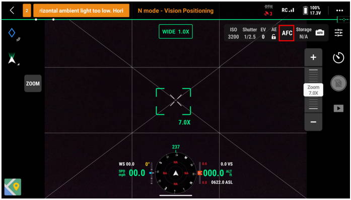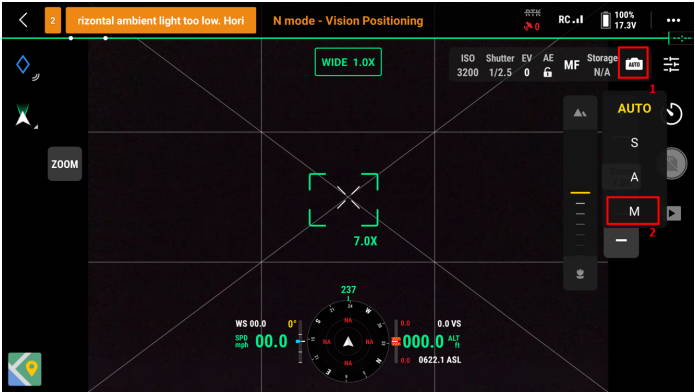 Upewnij się, że wybrałeś "AFC" (Auto Focus Continuous) jako opcję ostrości i ustawiłeś automatyczną ekspozycję "AE" jako odblokowaną. Następnie wybierz tryb kamery i wybierz "M '' jako tryb ręczny, auto ISO i przysłonę zgodnie z otoczeniem, zaleca się również ustawienie czasu otwarcia migawki szybszego niż 1/500s.