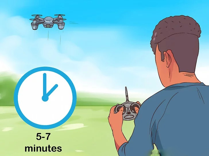 Różne klasy wielkości dronów różnią się czasem lotu, ale minimalna długość wynosi około 5-7 minut dla dronów nano/mikro. Przed startem zwróć uwagę na żywotność baterii i deklarowaną długość lotu drona i pamiętaj, aby sprowadzić go na ziemię przed upływem tego czasu.