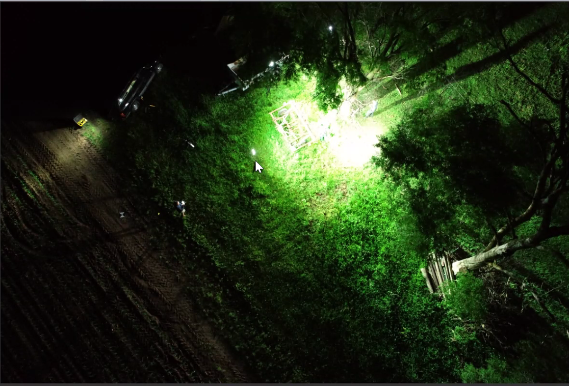 Kolejnym etapem jest właściwe oświetlenie sceny. Ustawienie świateł na podwyższeniu (~8 stóp) wokół sceny i skierowanie ich w dół stworzy aureolę światła wokół obiektu. W tym momencie operator może umieścić drona nad miejscem wypadku, aby stwierdzić, czy światła tworzą prześwietlone zdjęcie. Jeśli tak, należy dostosować moc światła lub cofnąć światło (światła).