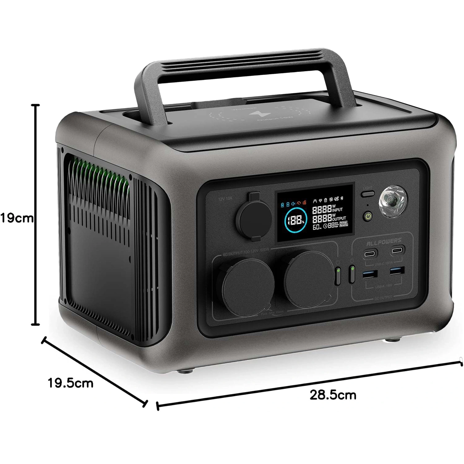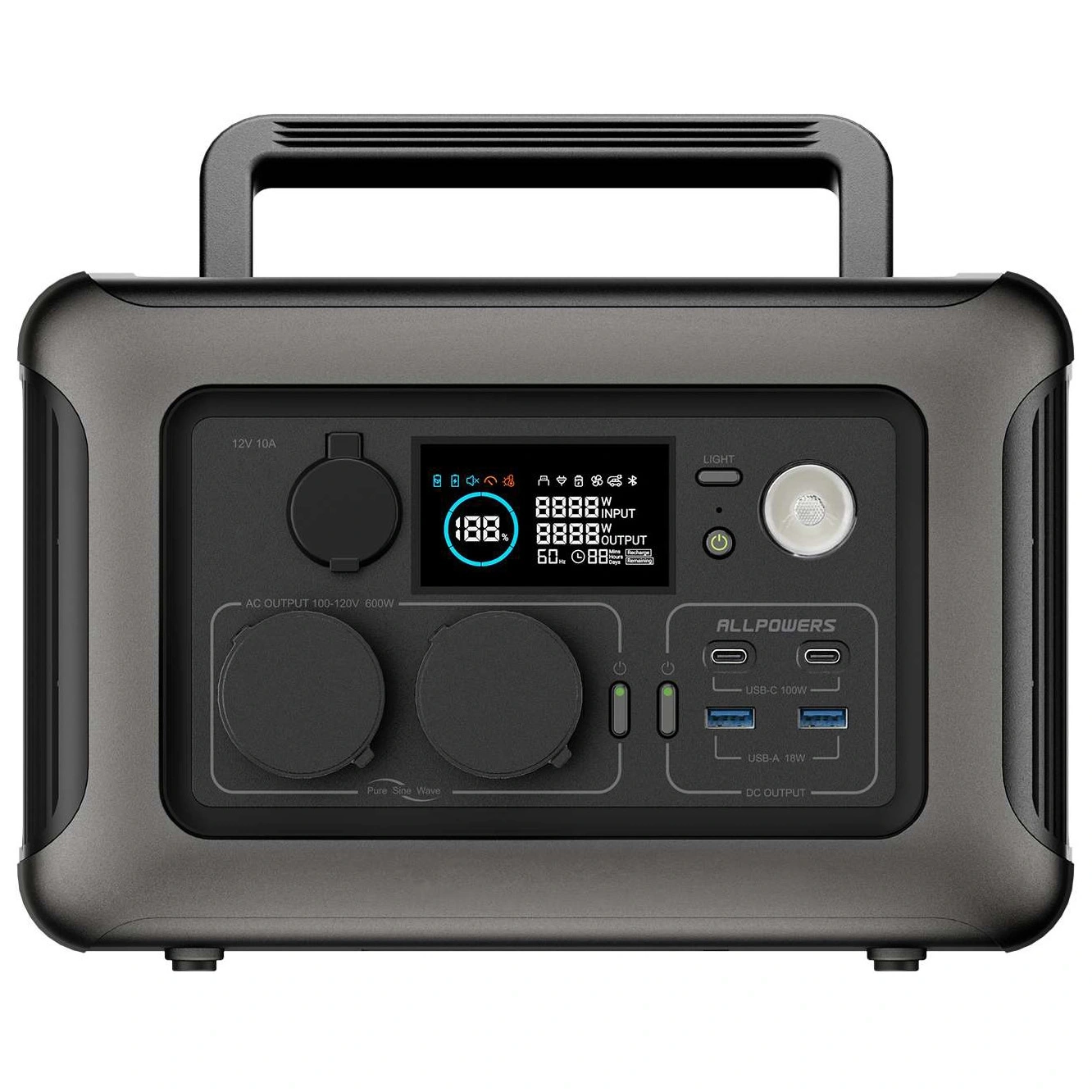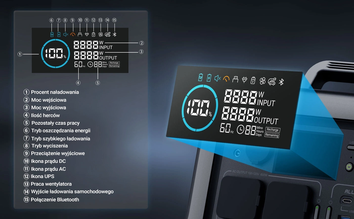 ALLPOWERS R600 został wyposażony w intuicyjny wyświetlacz, który dostarcza kluczowe informacje o pracy urządzenia. Możesz sprawdzić takie parametry, jak procent naładowania, moc wejściowa i wyjściowa, pozostały czas pracy czy tryb oszczędzania energii. Dzięki czytelnym ikonkom masz pełną kontrolę nad działaniem stacji i zawsze wiesz, ile energii Ci pozostało.