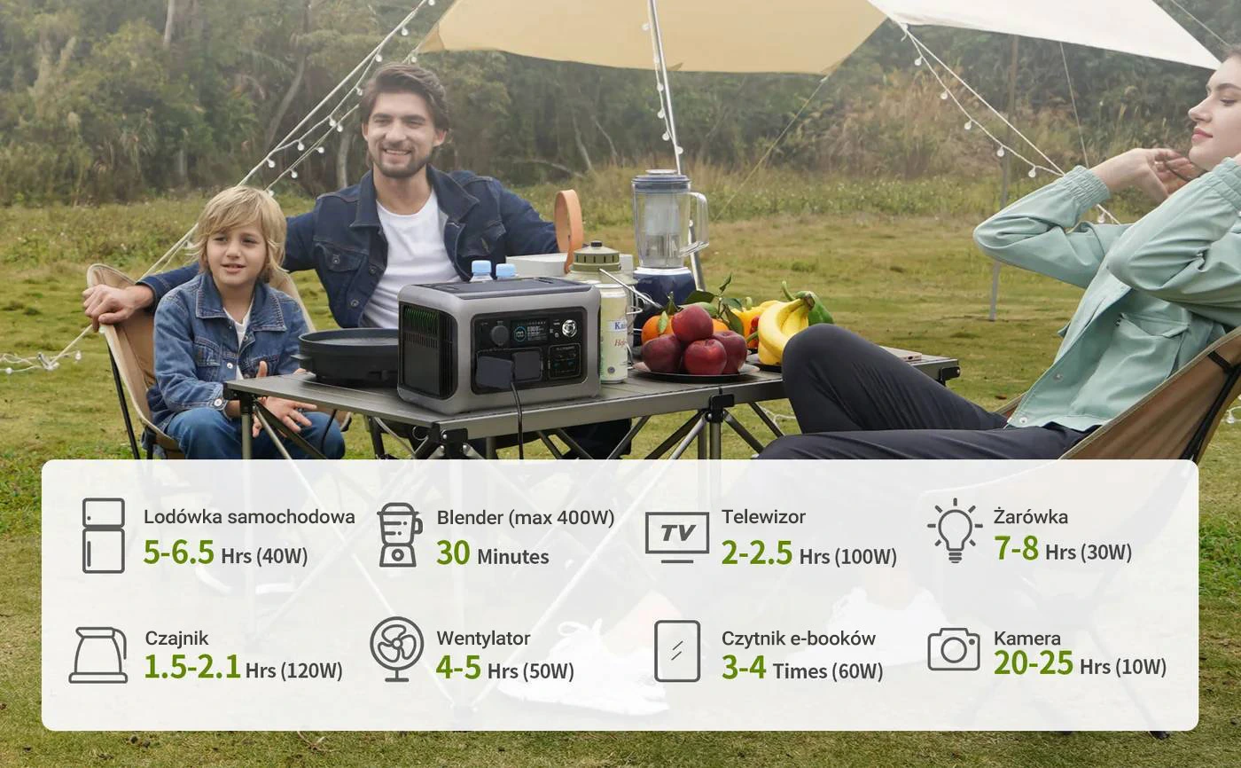 Ciesz się komfortem zasilania wszędzie, gdzie jesteś! ALLPOWERS R600 pozwala na ładowanie różnorodnych urządzeń, takich jak lodówki samochodowe, blendery, telewizory, wentylatory czy kamery. Dzięki wydajnemu akumulatorowi możesz korzystać z mocy przez wiele godzin – idealne rozwiązanie na kemping, piknik czy rodzinny wyjazd. ALLPOWERS R600 to niezawodny towarzysz każdej przygody.