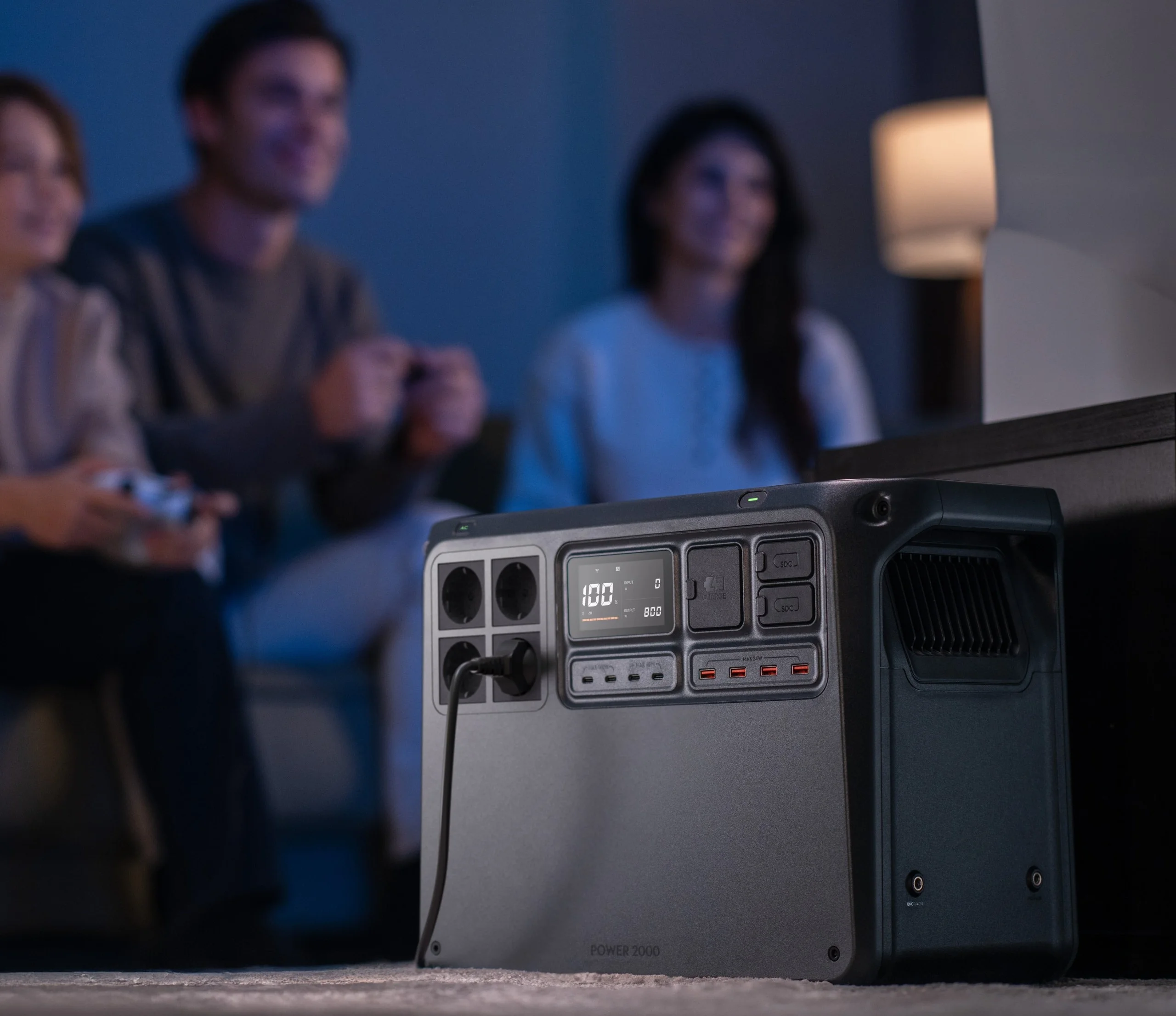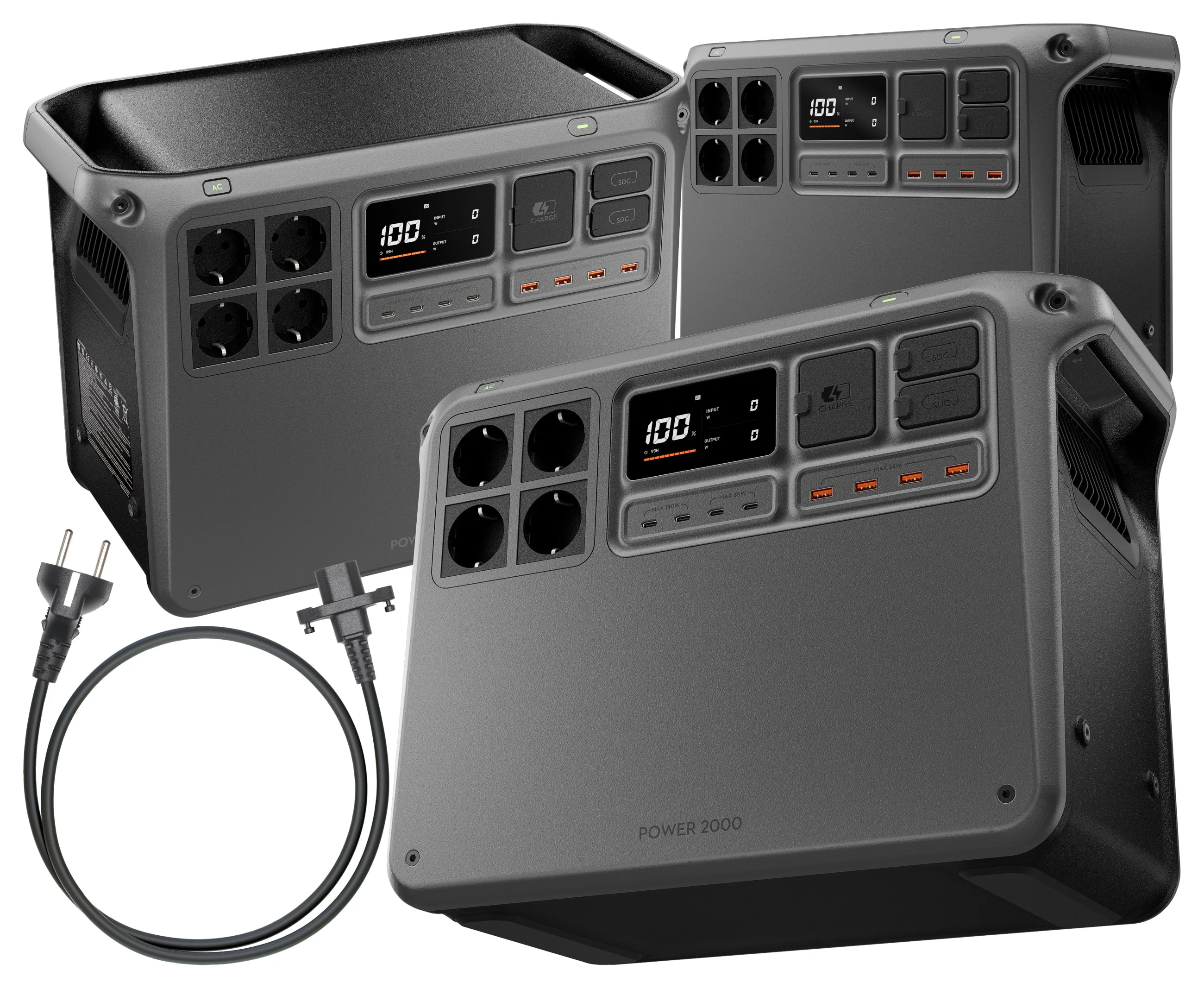 Z przodu obudowy znajdziesz 4 porty AC, 4 porty USB-C, 4 porty USB-A oraz 2 porty SDC, dzięki czemu możesz zasilać i ładować różne typy sprzętu jednocześnie. Od smartfonów, przez aparaty i laptopy, po energochłonne urządzenia domowe – DJI Power 2000 radzi sobie z nimi bez wysiłku. Każde gniazdo oferuje stabilną i bezpieczną pracę, co czyni stację uniwersalnym narzędziem w każdej sytuacji.